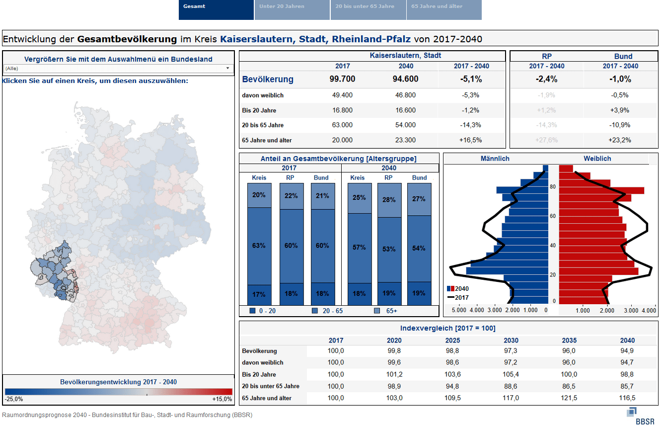 Es gibt Landkreise in Deutschland, die bis 2040 rund ein Fünftel ihrer Bevölkerung einbüßen werden. Gleichzeitig dürfte das Durchschnittsalter in den nächsten zwei Jahrzehnten stark ansteigen – mit gravierenden Folgen für die notwendige örtliche Politik. Wie sich die Bevölkerung im Detail entwickelt, zeigt eine Bevölkerungsprognose des Bundesinstituts für Bau-, Stadt und Raumforschung: Eine interaktive Anwendung zeigt die Trends bei der Gesamtbevölkerung in jedem Landkreis und jeder kreisfreien Stadt, daneben die Entwicklung in den Altersgruppen und nach Geschlecht. Demnach wird in Rheinland-Pfalz besonders in Ludwigshafen und Mainz mit einem Zuwachs der Bevölkerung gerechnet.