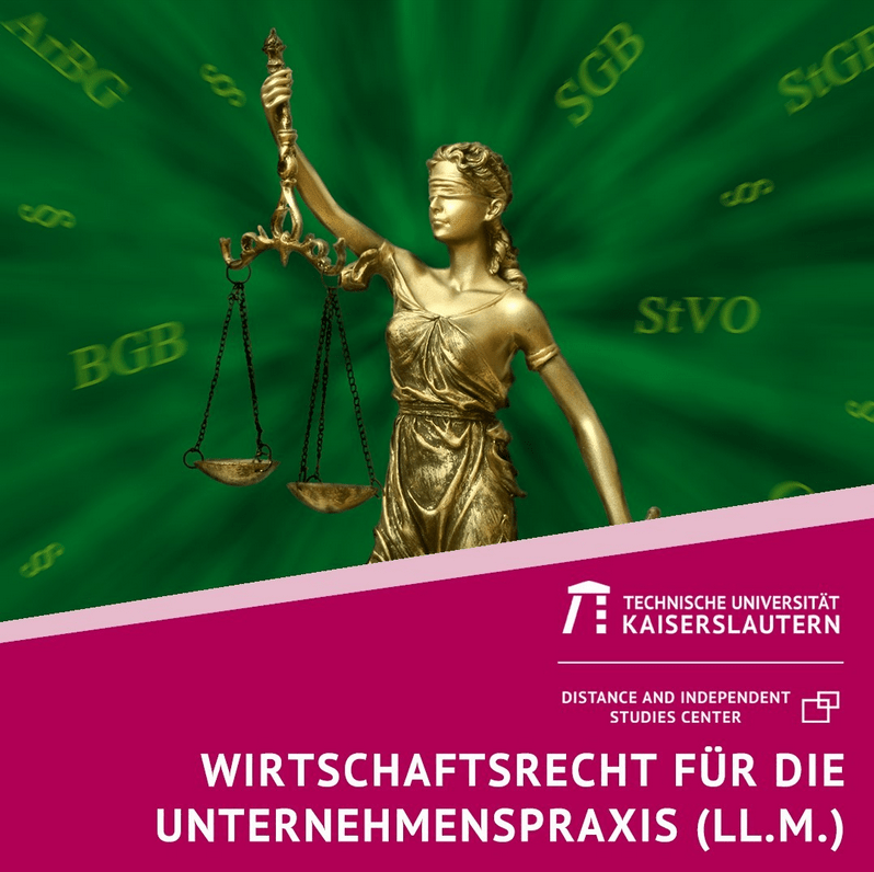 Wirtschaftsrecht ist ein komplexes Feld. Um kostspielige Fehler zu vermeiden, müssen nicht nur Rechtsabteilungen von Unternehmen zahlreiche Zusammenhänge und Regelungen kennen. Auch in anderen Bereichen wie der Forschung und Entwicklung ist das Wissen im Berufsalltag gefragt. Genau darauf geht der viersemestrige Fernstudiengang Wirtschaftsrecht für die Unternehmenspraxis ein. Das Distance and Independent Studies Center (DISC) an der Technischen Universität Kaiserslautern (TUK) bietet den berufsbegleitenden, kostenpflichtigen Masterstudiengang in Kooperation mit der Universität des Saarlandes an. Interessierte können sich bis zum 31. August 2021 bewerben.