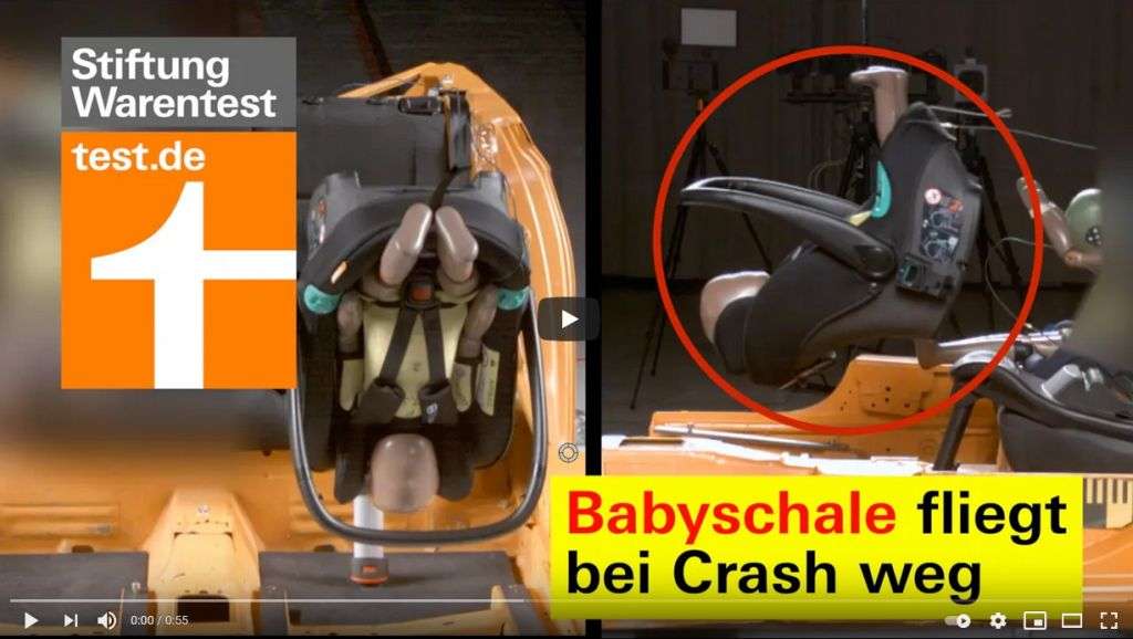 Katastrophenszenario im Crashtest von Stiftung Warentest und ADAC: Beim Test eines Chicco-Kindersitzes löste sich die Babyschale von der Basis und flog samt Kinder-Dummy durch das Prüflabor. Im Falle eines Unfalles besteht so Lebensgefahr für das Baby.