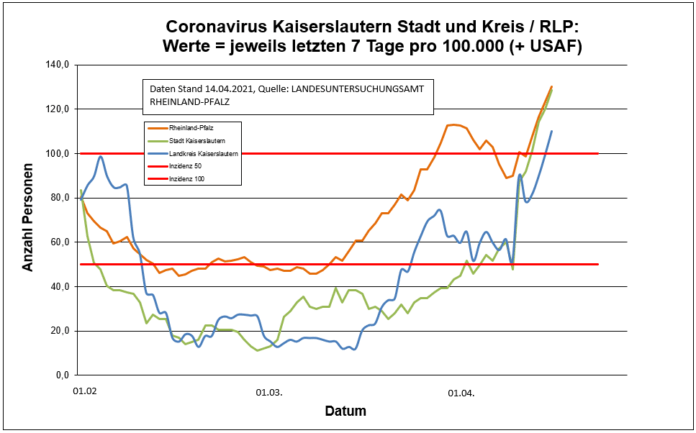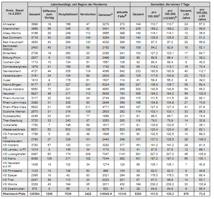 Coronavirus SARS-CoV-2: Aktuelle Fallzahlen für Rheinland-Pfalz, (Datenstand vom 14.04.2021, 14:10 Uhr)