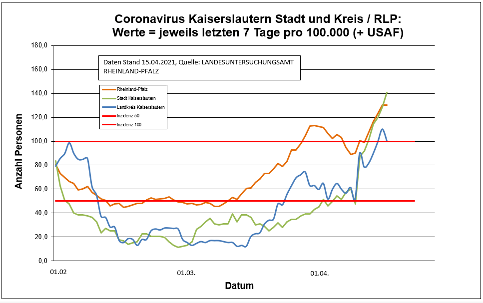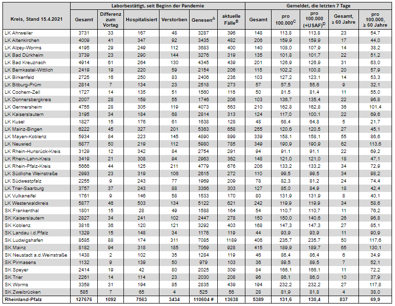Coronavirus SARS-CoV-2: Aktuelle Fallzahlen für Rheinland-Pfalz, (Datenstand vom 15.04.2021, 14:10 Uhr)