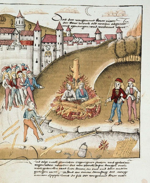 Bu: Vorwurf der Homosexualität: Verbrennung des elsässischen Adligen Richard Puller von Hohenburg und seines Geliebten Anton Mätzler vor den Toren Zürichs, um 1482 – Pullers Burg und Herrschaft Nanstein fielen an seinen Großneffen Franz von Sickingen