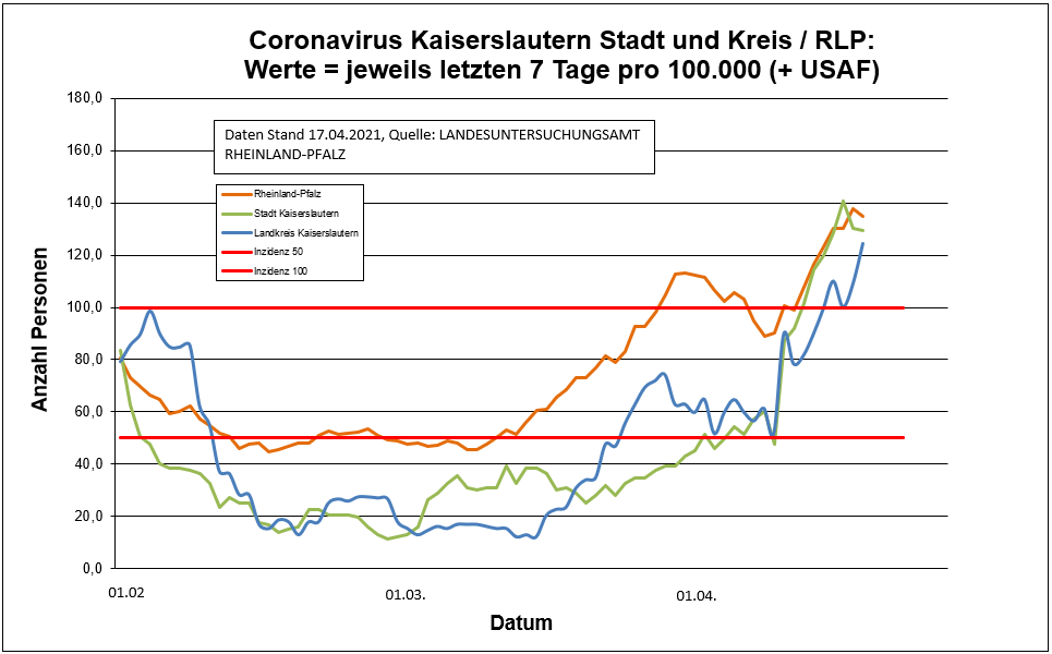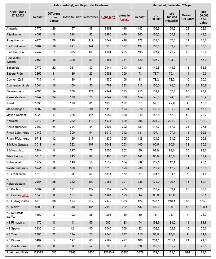 Coronavirus SARS-CoV-2: Aktuelle Fallzahlen für Rheinland-Pfalz, (Datenstand vom 17.04.2021, 11:15 Uhr)