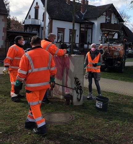 Foto (c) Stadtbildpflege Kaiserslautern: Half beim Entfernen der Graffiti kräftig mit: Bürgermeisterin Beate Kimmel mit Mitarbeitern der Stadtbildpflege.