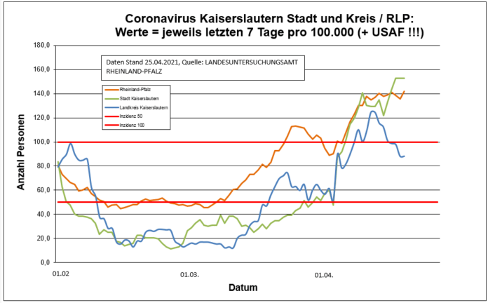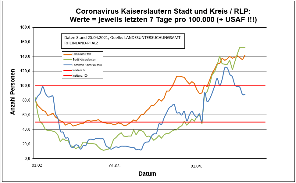 Coronavirus KL letzten 7 Tage pro 100.000 (ohne USAF): Stadt 163,0 ; Landkreis 102,9 ; RLP 143,1