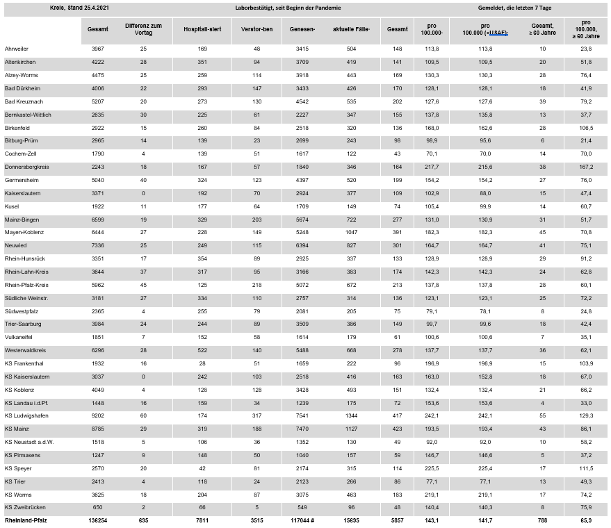 Coronavirus SARS-CoV-2: Aktuelle Fallzahlen für Rheinland-Pfalz, (Datenstand vom 25.04.2021, 11:10 Uhr)