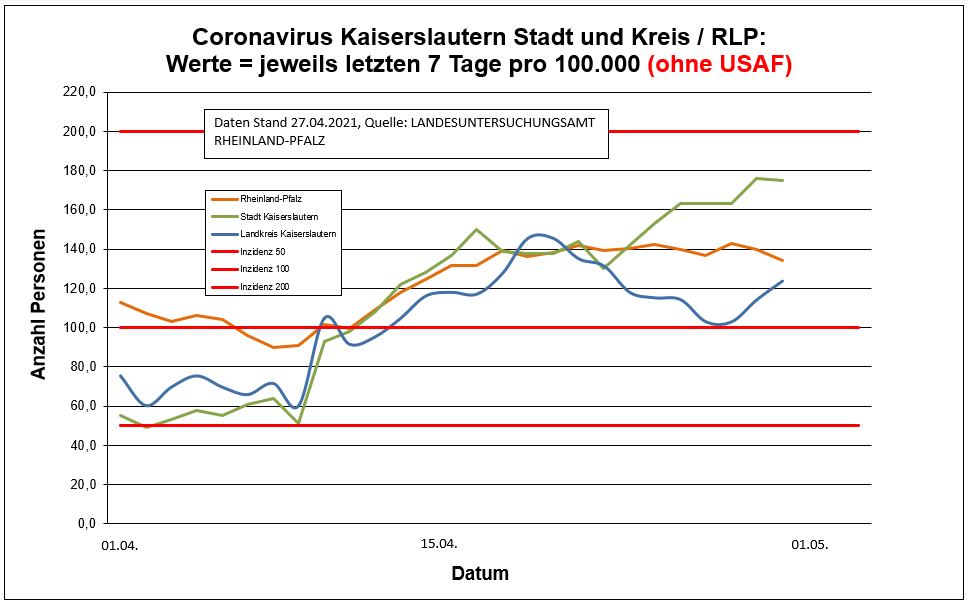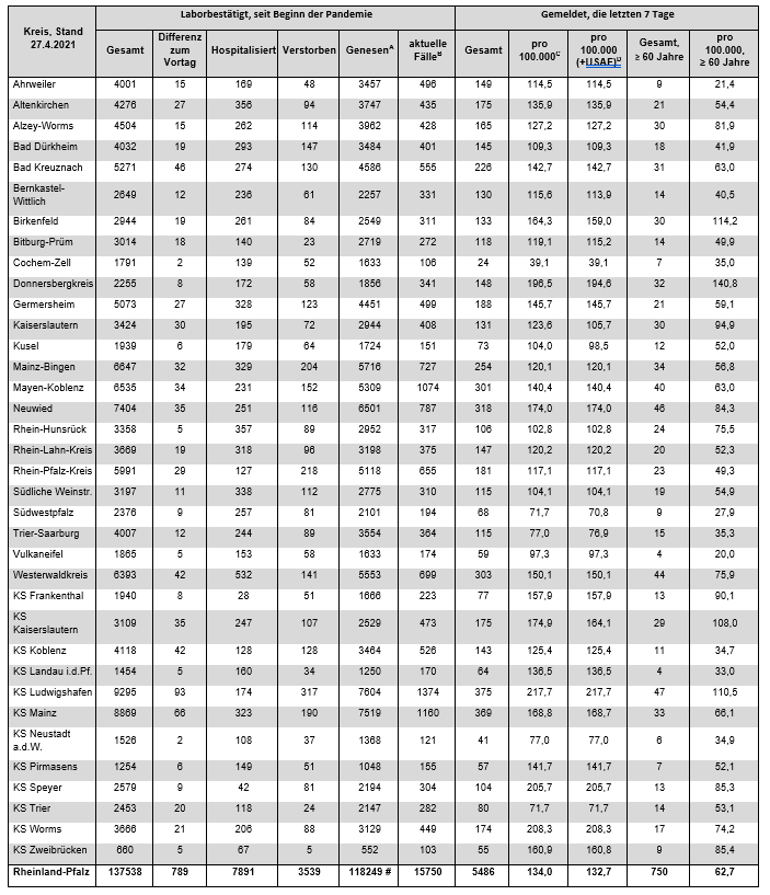 Coronavirus SARS-CoV-2: Aktuelle Fallzahlen für Rheinland-Pfalz, (Datenstand vom 27.04.2021, 14:10 Uhr)