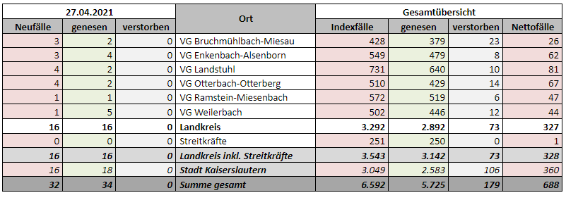 6.592 Indexfälle in Stadt und Landkreis, 5.725 genesenen Personen, 179 Todesfälle, 27.04.2021