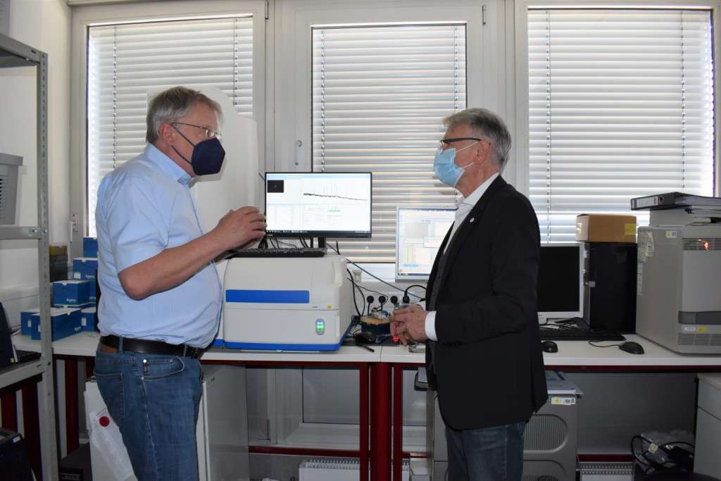 Oberbürgermeister Klaus Weichel hat sich gestern mit Dr. med. Bernhard Thiele vom Institut für Immunologie und Genetik getroffen. Das Treffen fand im Institut statt, wo geprüft wird, mit welcher Corona-Virus-Variante sich positiv Getestete infiziert haben.