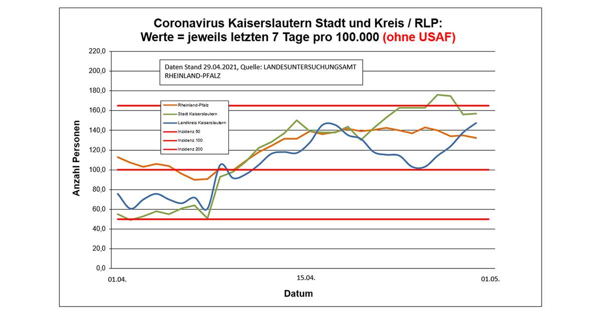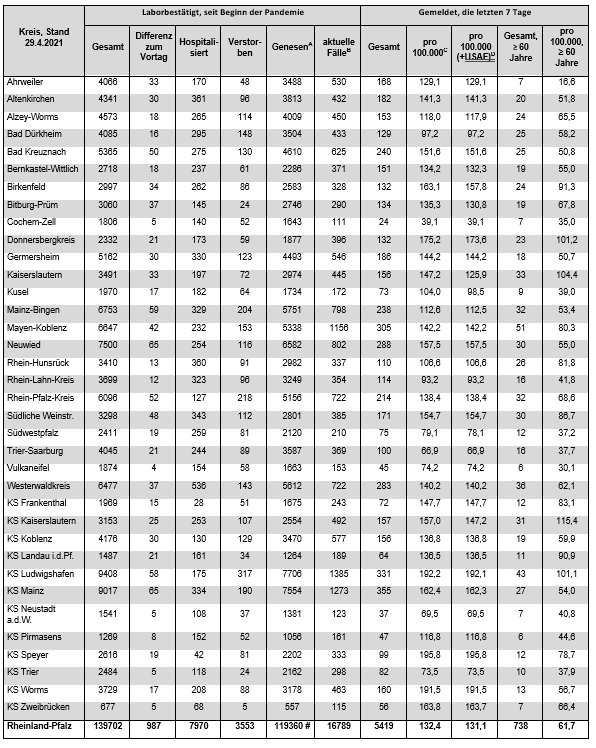 Coronavirus SARS-CoV-2: Aktuelle Fallzahlen für Rheinland-Pfalz, (Datenstand vom 29.04.2021, 14:10 Uhr)
