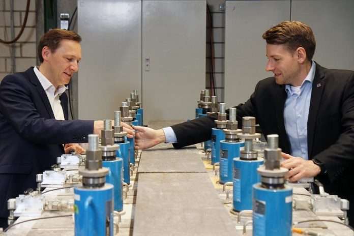 Das Team um die beiden Forscher (Professor Matthias Pahn, links, und Stefan Carstens, rechts) untersucht die mechanischen und bauphysikalischen Eigenschaften der Betondecken. Foto: Koziel/TUK