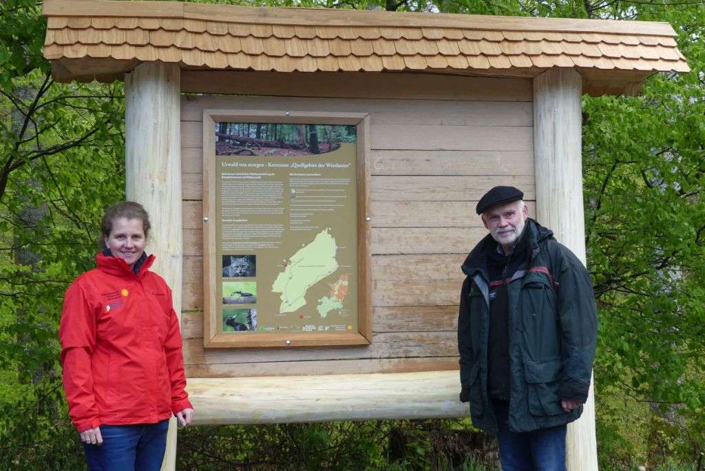 Informierten über die neue Beschilderung an der Kernzone „Quellgebiet der Wieslauter“: Biosphärenreservats-Direktorin Friedericke Weber und Forstamtsleiter Michael Grünfelder (Foto: Biosphärenreservat/frei)