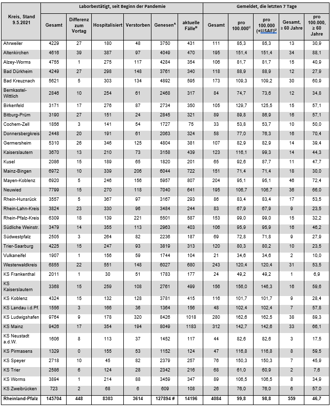 Coronavirus SARS-CoV-2: Aktuelle Fallzahlen für Rheinland-Pfalz, (Datenstand vom 09.05.2021, 11:13 Uhr)
