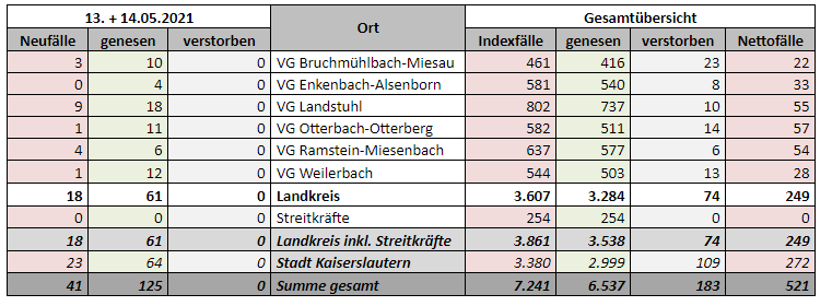 7.241 Indexfälle in Stadt und Landkreis, 6.537 genesenen Personen, 183 Todesfälle, 14.05.