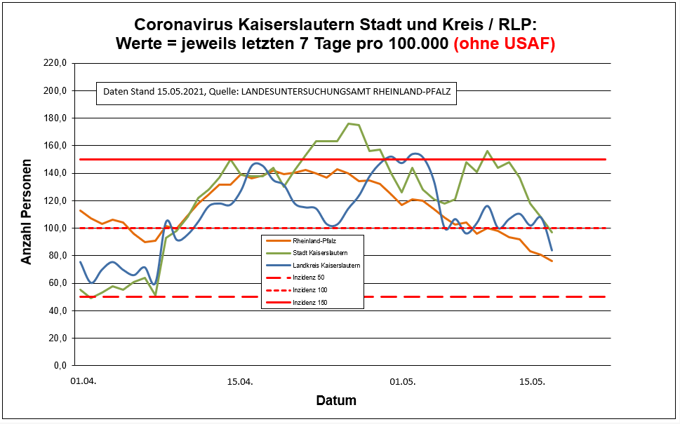 Coronavirus KL letzten 7 Tage pro 100.000 (ohne USAF): Landkreis 84,0 ; Stadt 97,0 ; RLP 76,2