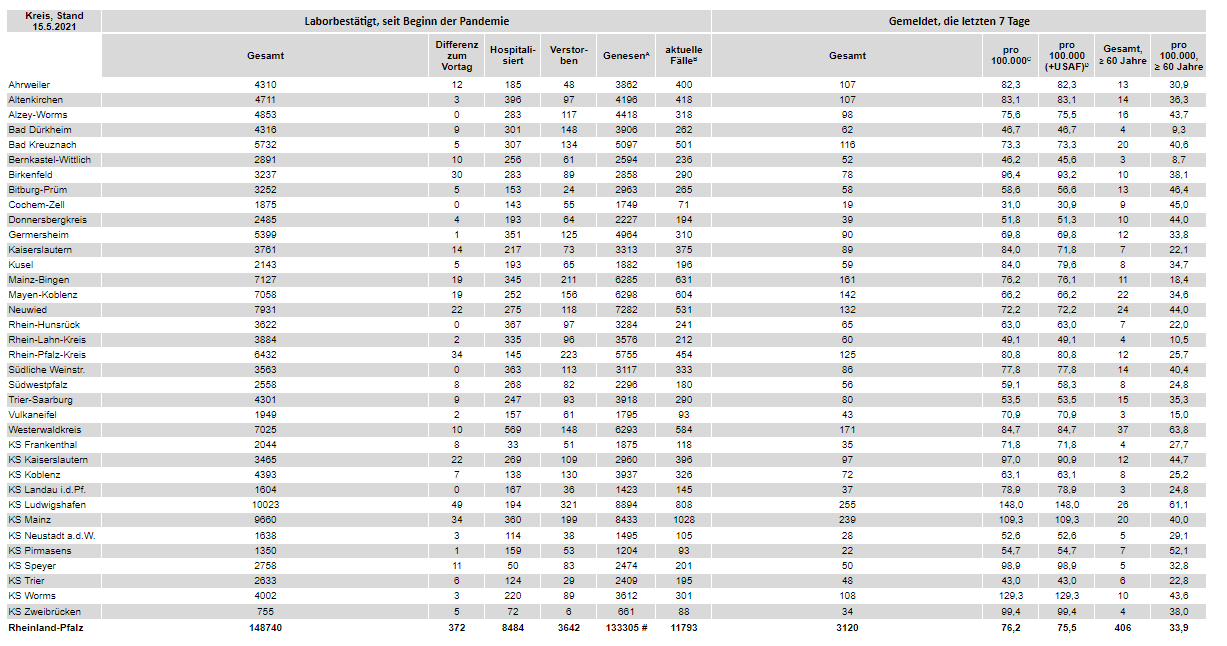 Coronavirus SARS-CoV-2: Aktuelle Fallzahlen für Rheinland-Pfalz, (Datenstand vom 15.05.2021, 11:10 Uhr)