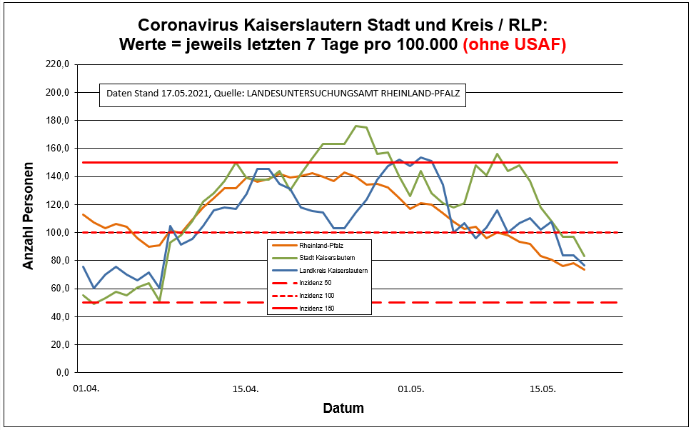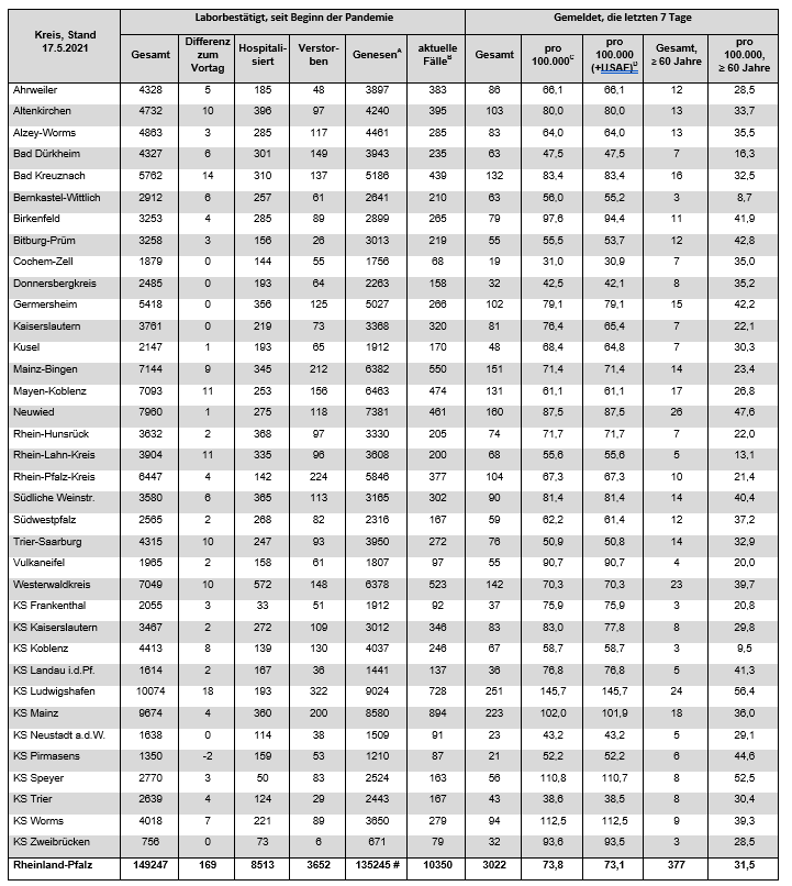 Coronavirus SARS-CoV-2: Aktuelle Fallzahlen für Rheinland-Pfalz, (Datenstand vom 17.05.2021, 14:10 Uhr)