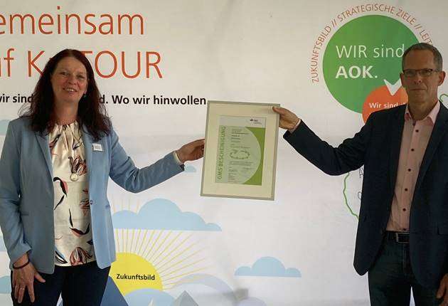 Glücklich nahm die AOK-Vorstandsvorsitzende, Dr. Martina Niemeyer, die für drei Jahre gültige Bescheinigung in Empfang: „Wir bieten unseren externen Kundinnen und Kunden erstklassigen Service in Sachen Prävention sowie Gesundheitsförderung und legen die gleiche Messlatte natürlich auch bei den Angeboten für unsere eigenen Mitarbeitenden an. Es freut mich, wenn die unabhängigen Expertinnen und Experten der VBG bescheinigen, dass unsere Herangehensweise und eingeleiteten Maßnahmen den geforderten Qualitätsaspekten entsprechen“, so Niemeyer.
