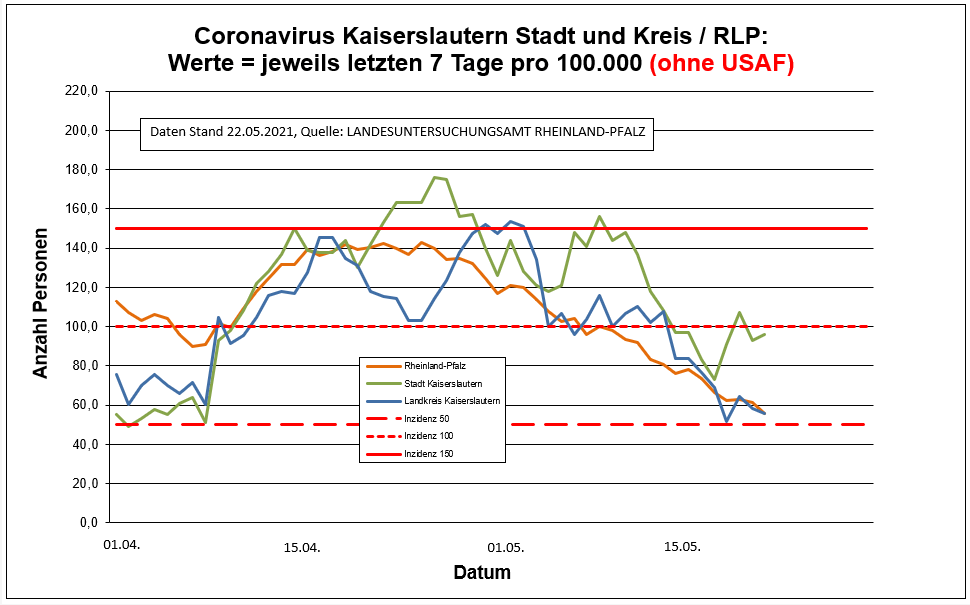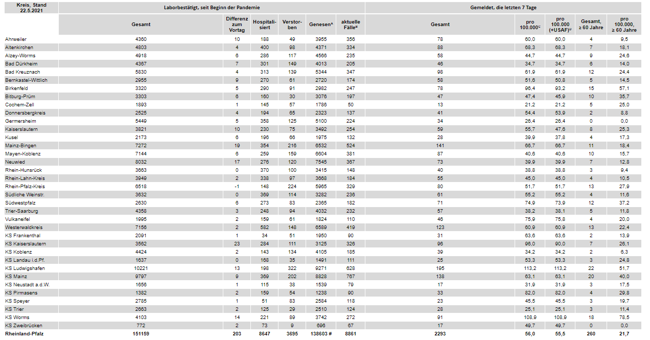 Coronavirus SARS-CoV-2: Aktuelle Fallzahlen für Rheinland-Pfalz, (Datenstand vom 22.05.2021, 11:10 Uhr)