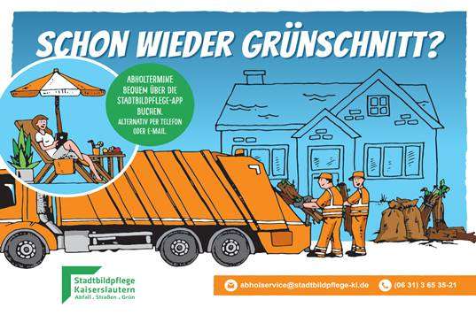 Um Gartenbesitzer dabei zu unterstützen, den Garten auf Vordermann zu bringen, hat die Stadtbildpflege Kaiserslautern ab diesem Jahr ihr Serviceangebot erweitert und bietet nun eine Abholung von Baum- und Strauchschnitt am Privatgrundstück an. „Bequem und kostengünstig haben Hobbygärtner die Möglichkeit, den Transport und die Entsorgung der sperrigen Äste und Zweige uns zu überlassen“, so Andrea Buchloh-Adler, Werkleiterin der Stadtbildpflege. Für größere Grünschnittmengen bietet der städtische Entsorgungsbetrieb Absetzcontainer an.