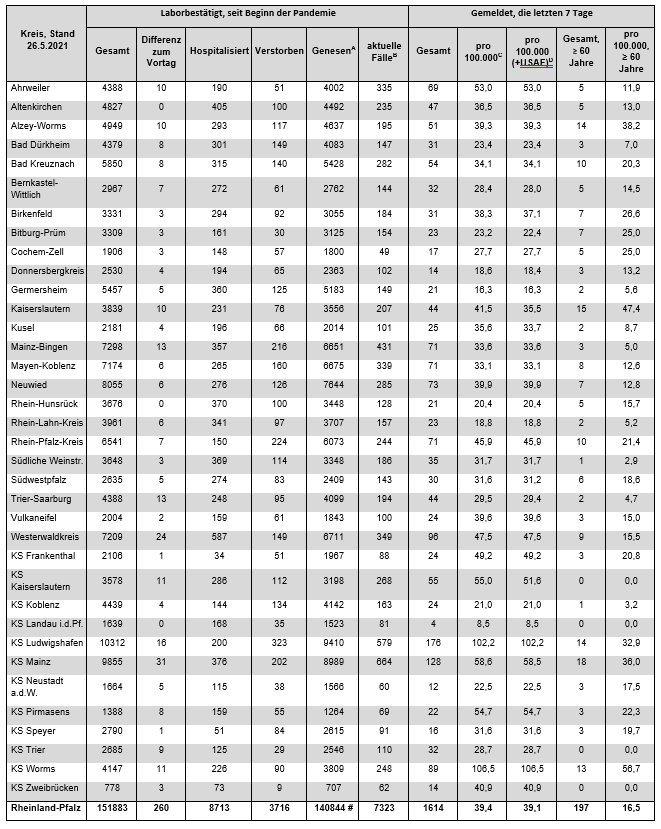 Coronavirus SARS-CoV-2: Aktuelle Fallzahlen für Rheinland-Pfalz, (Datenstand vom 26.05.2021, 14:10 Uhr)