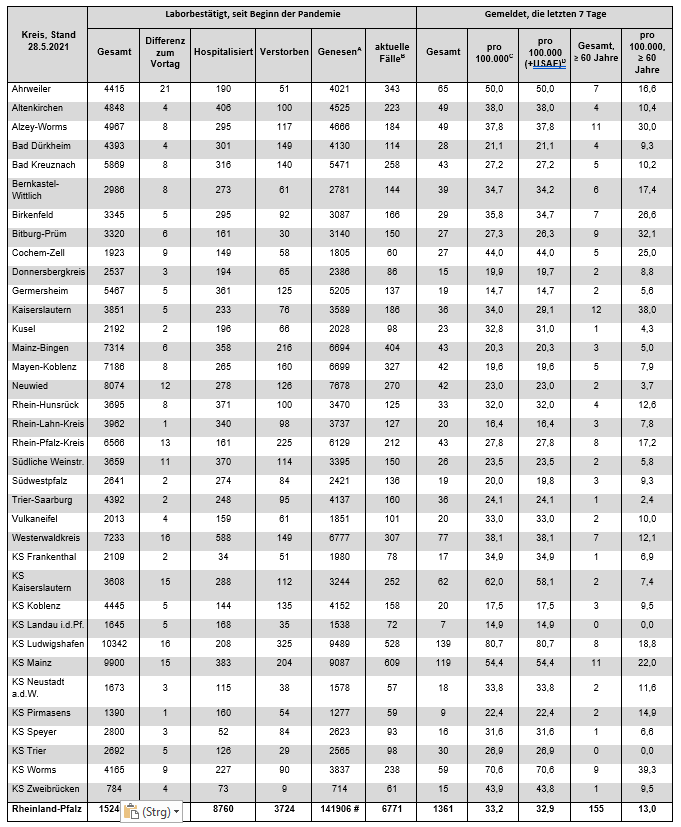 Coronavirus SARS-CoV-2: Aktuelle Fallzahlen für Rheinland-Pfalz, (Datenstand vom 28.05.2021, 14:10 Uhr)