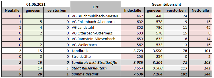 7.539 Indexfälle in Stadt und Landkreis, 7.104 genesenen Personen, 191 Todesfälle, 01.06.