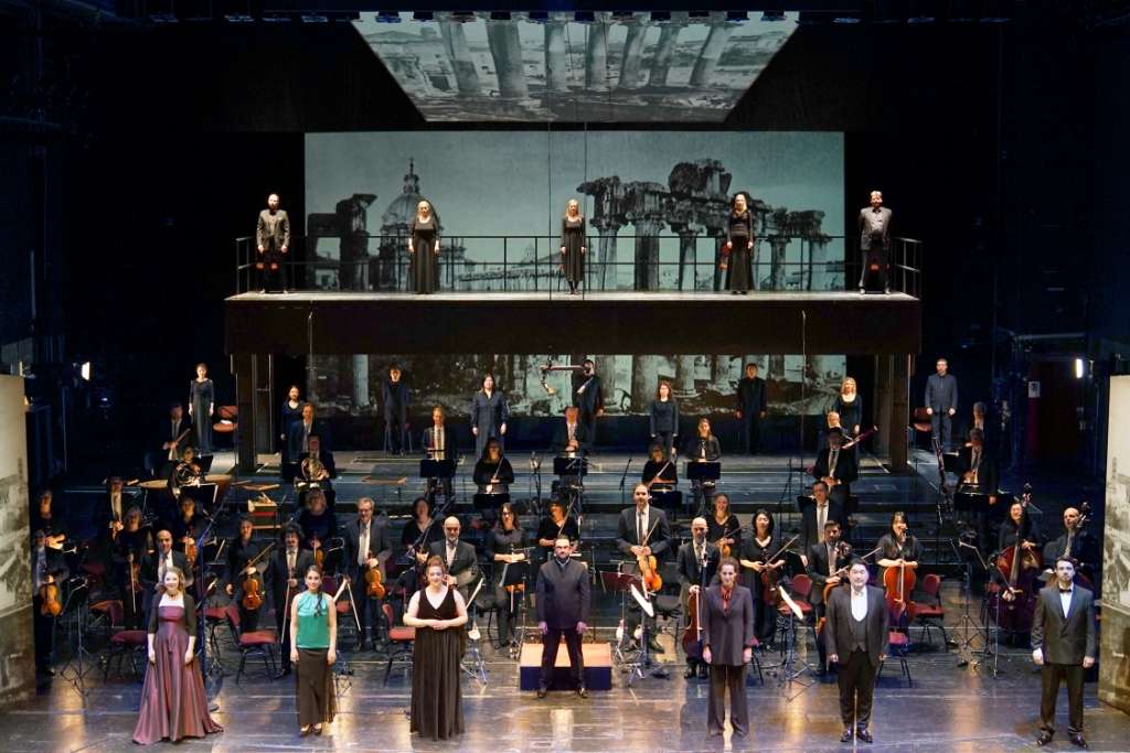 Es singen Rosario Chávez, Monika Hügel, Inga Kalna/Dorothea Maria Marx, Marie Seidler, Daniel Kim und Bartolomeo Stasch sowie der Chor des Pfalztheaters.