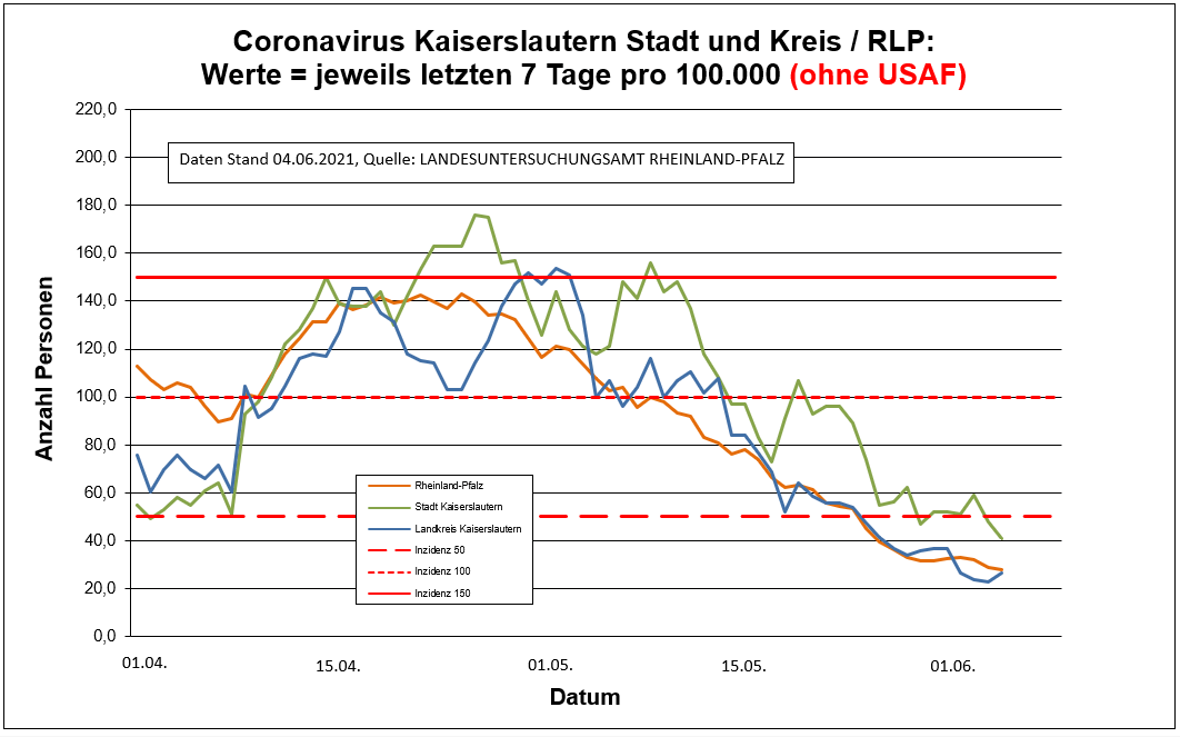 Coronavirus KL letzten 7 Tage pro 100.000 (mit USAF!!!): Landkreis 22,6 ; Stadt 38,4 ; RLP 27,8