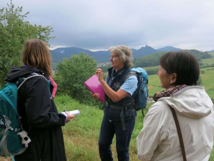 Bildunterschrift: Zeigen die Vielfalt des Biosphärenreservats Pfälzerwald-Nordvogesen: Die Biosphären-Guides, hier Andrea Frech mit einer Gruppe bei Gräfenhausen (Foto: Biosphärenreservat/frei)