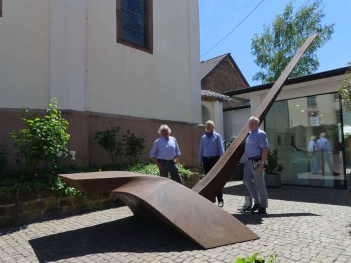 „Die Plastik von Franz Bernhard ist imposant und beeindruckend und passt hervorragend vor das Museum Pfalzgalerie Kaiserslautern“, stellt Bezirkstagsvorsitzender Theo Wieder fest, als er vor dem sechs Meter hohen Kunstwerk im Hof des KunstKabinetts Tiefenthal steht. Dort hat er sich mit den beiden Projektinitiatoren Manfred Geis, Vorsitzender des Ausschusses für Kunst, Kultur, pfälzische Geschichte und Volkskunde des Bezirkstags Pfalz, und Wolfgang Thomeczek, Leiter des KunstKabinetts Tiefenthal, getroffen, um sich einen Eindruck von Bernhards Spätwerk zu machen, das in einer Speyerer Werft entstand. Eine Spendenaktion soll helfen, die rund eineinhalb Tonnen schwere „Aufragende“ für die Pfalz zu erwerben. Dass es „Ein Bernhard für die Pfalz“ sein soll, wird dadurch dokumentiert, dass „das Werk bewusst auf dem repräsentativen Platz vor dem mpk in Kaiserslautern aufgestellt werden soll“, so die Initiatoren Geis und Thomeczek.