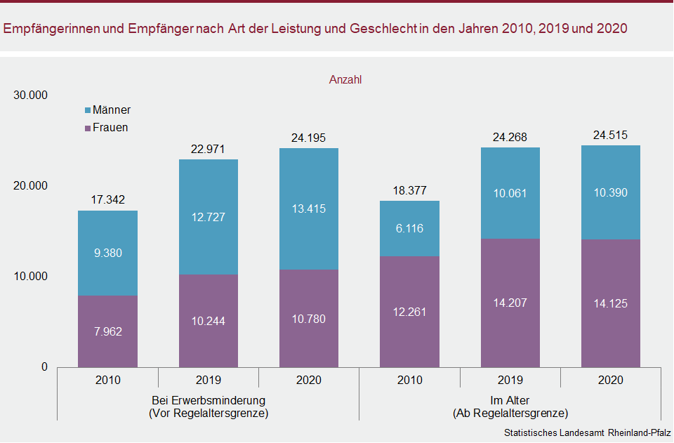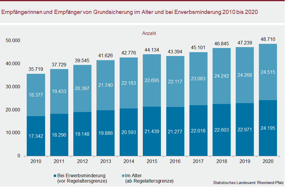 Zum Jahresende 2020 erhielten in Rheinland-Pfalz rund 48.700 Personen staatliche Leistungen der Grundsicherung im Alter und bei Erwerbsminderung nach dem Zwölften Sozialgesetzbuch. Wie das Statistische Landesamt in Bad Ems mitteilt, ist die Anzahl der Leistungsbezieherinnen und Leistungsbezieher gegenüber dem Vorjahr um knapp 1.500 bzw. 3,1 Prozent angestiegen. In den vergangenen zehn Jahren hat sich der Empfängerkreis nahezu kontinuierlich um rund 13.000 Frauen und Männer bzw. 36,4 Prozent ausgedehnt.