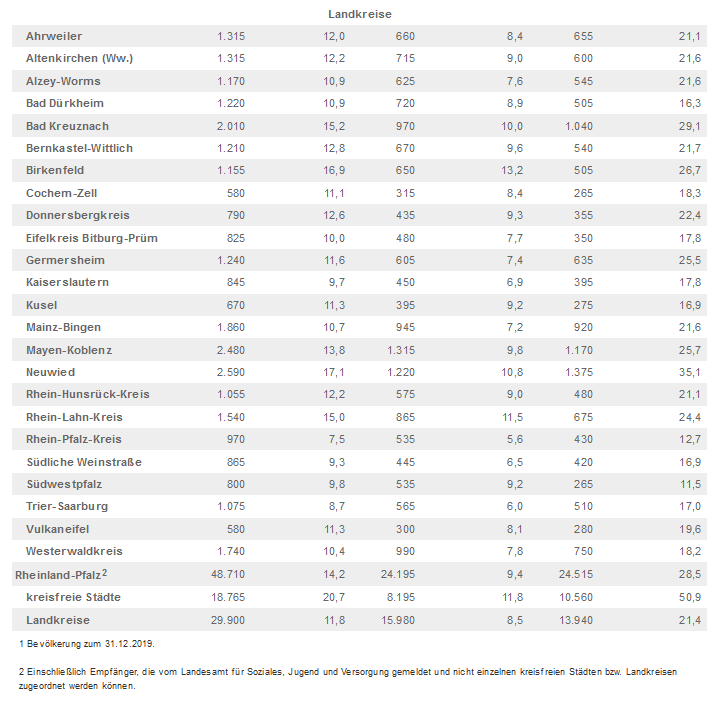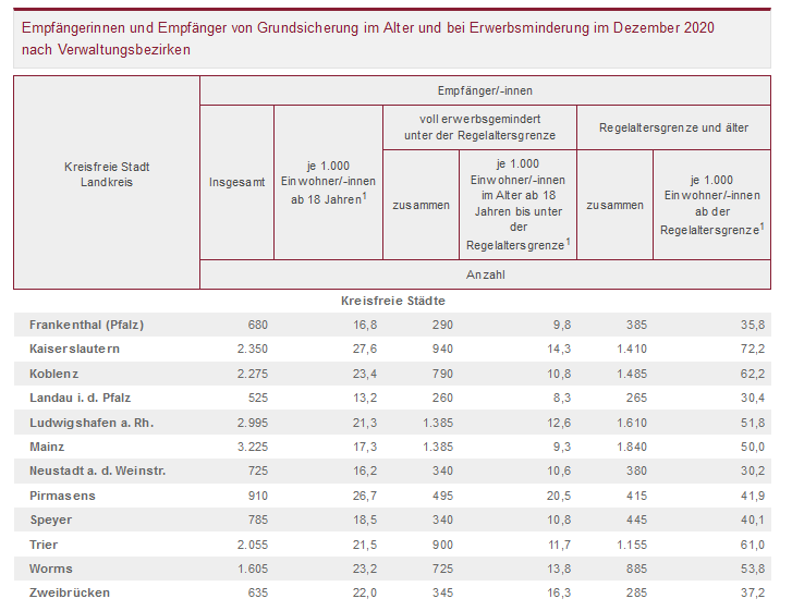 Der Anteil der Personen mit Grundsicherungsbezug an der Gesamtbevölkerung ab 18 Jahren lag zuletzt bei 1,4 Prozent. Regional zeigen sich große Unterschiede. So kamen in den kreisfreien Städten auf 1.000 volljährige Einwohnerinnen und Einwohner im Durchschnitt 21 Leistungsempfängerinnen und -empfänger, in den Landkreisen waren es dagegen nur 12. Werden ausschließlich Empfängerinnen und Empfänger von Grundsicherung im Alter betrachtet, so fallen die regionalen Unterschiede noch größer aus: Während in der Südwestpfalz lediglich 11,5 Personen je 1.000 Einwohnerinnen und Einwohner oberhalb der Regelaltersgrenze die staatliche Leistung in Anspruch nahmen, waren dies in der Stadt Kaiserslautern 72,2 Personen. Im Mittel aller Landkreise lag dieser Wert bei 21,4; in den kreisfreien Städten bezogen hingegen rund 50,9 Personen je 1.000 Einwohnerinnen und Einwohner oberhalb der Regelaltersgrenze Grundsicherungsleistungen.