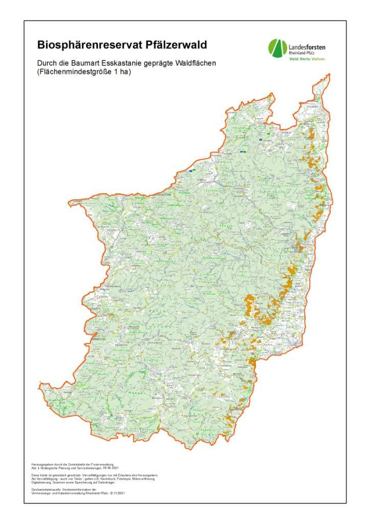 Die Edelkastanie (Castanea sativa) ist eine der Charakterbaumarten des Pfälzerwaldes. Sie kann sicherlich als regionales Alleinstellungsmerkmale bezeichnet werden, denn die Hälfte aller bundesdeutschen Edelkastanienvorkommen befinden sich mit etwa 3000 Hektar in den südpfälzischen Forstämtern Annweiler und Haardt. Weitere geschlossene Bestände schließen sich dann weiter nördlich im Forstamt Bad Dürkheim an. Demnächst sticht sie wieder aus dem scheinbar unendlichen Grün des Waldgebirges hervor. Die Forstleute rechnen Mitte Juni mit dem Blühbeginn. Durch ihre weißlich-gelben Blüten zeigt sich dann gut sichtbar ein fast lückenloses Band am Ostabfall des Pfälzerwaldes (vgl. Karte). Danach kann dieses Naturschauspiel für mindestens drei Wochen erlebt werden.