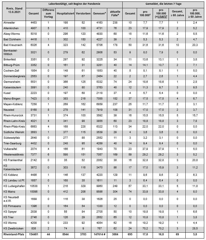Coronavirus SARS-CoV-2: Aktuelle Fallzahlen für Rheinland-Pfalz, (Datenstand vom 13.06.2021, 11:10 Uhr)