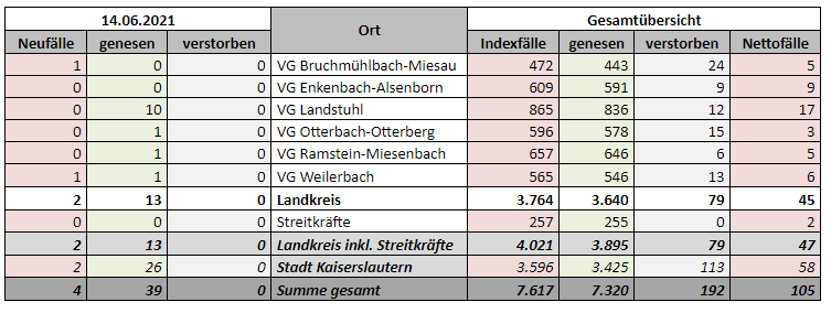 7.617 Indexfälle in Stadt und Landkreis, 7.320 genesenen Personen, 192 Todesfälle, 14.06.