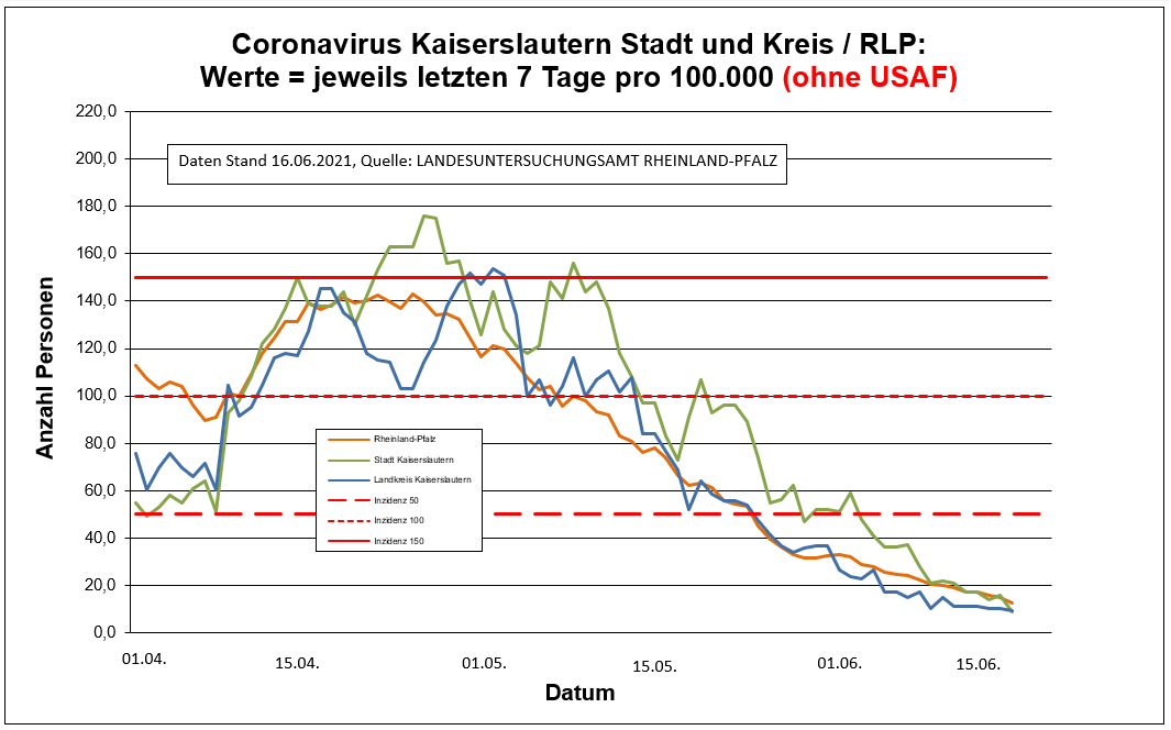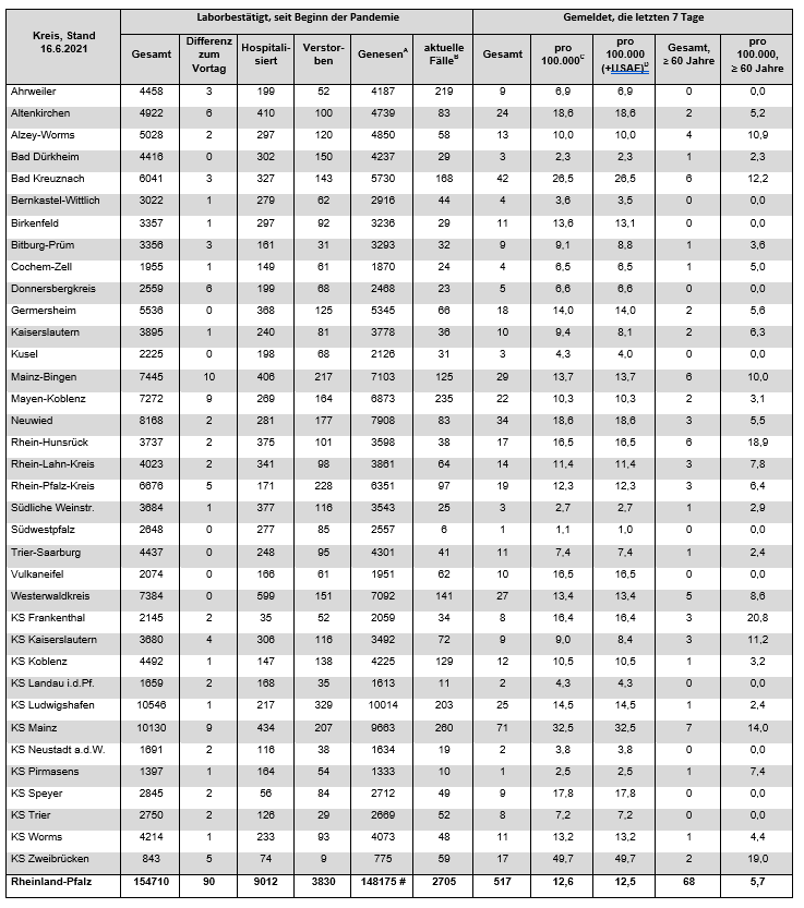 Coronavirus SARS-CoV-2: Aktuelle Fallzahlen für Rheinland-Pfalz, (Datenstand vom 16.06.2021, 14:10 Uhr)