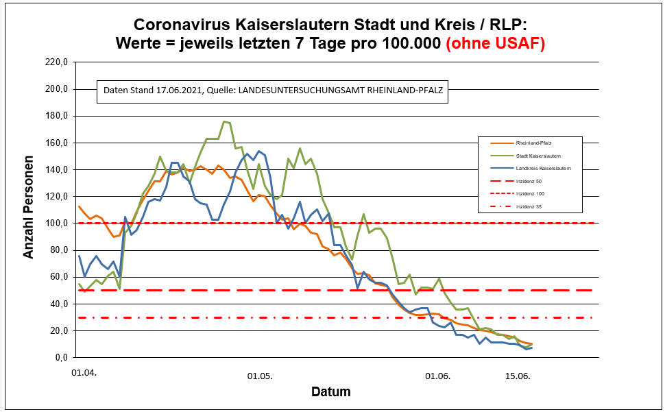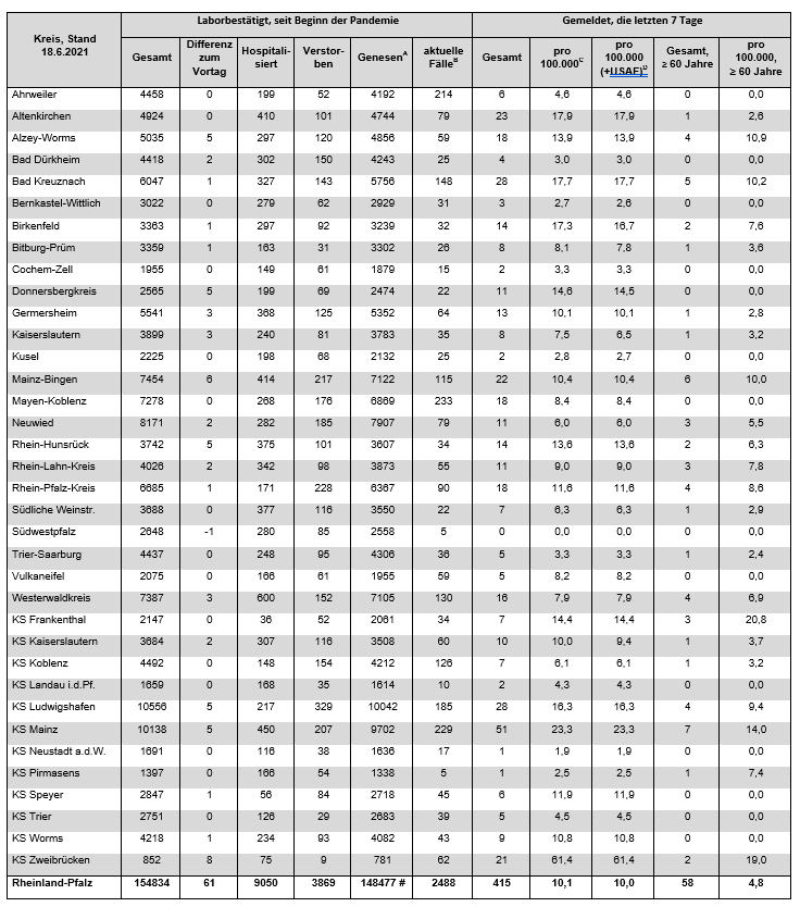 Coronavirus SARS-CoV-2: Aktuelle Fallzahlen für Rheinland-Pfalz, (Datenstand vom 18.06.2021, 14:10 Uhr)