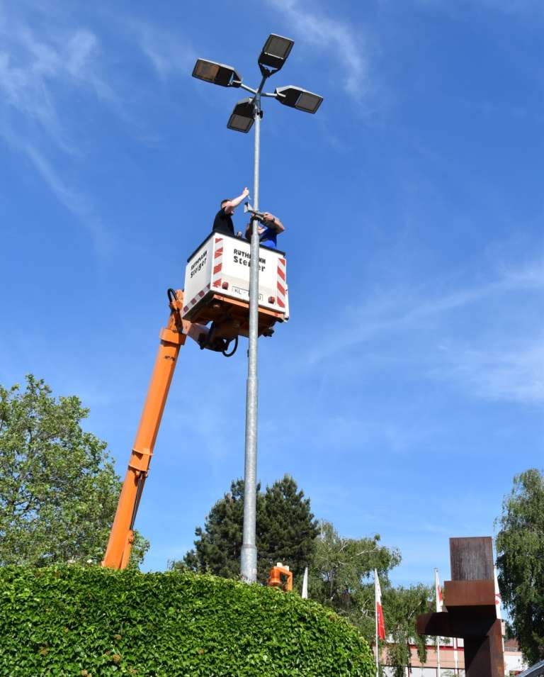 BU: Auch auf dem Rathausvorplatz wurde die Signalisierung getestet. Das Foto zeigt die Montage der Sirene am Morgen des 16. Juni.