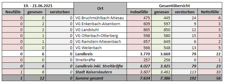 7.634 Indexfälle in Stadt und Landkreis, 7.386 genesenen Personen, 192 Todesfälle, 21.06.