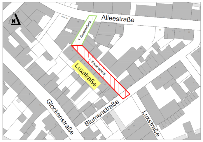 Aus baulichen Gründen wird der Kanal in der Luxstraße, zwischen Allee- und Blumenstraße, voraussichtlich ab dem 12.07.2021 erneuert. Die Arbeiten beginnen aus Richtung der Alleestraße und dauern voraussichtlich bis Ende Oktober 2021 an. Die Luxstraße wird dabei abschnittweise und entsprechend des Baufortschrittes voll gesperrt. Die Allee- und Blumenstraße werden ebenfalls kurzfristig, zwecks Anbindung des Kanals, voll gesperrt. Fußgängerverkehr ist hiervon nicht betroffen. Die Anwohner werden zusätzlich informiert.