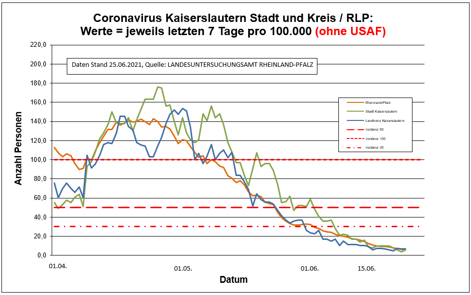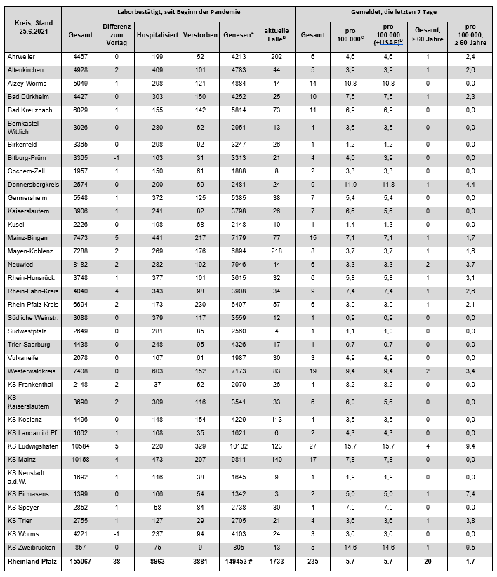 Coronavirus SARS-CoV-2: Aktuelle Fallzahlen für Rheinland-Pfalz, (Datenstand vom 25.06.2021, 14:10 Uhr)