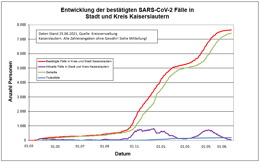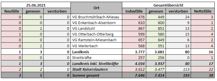 7.646 Indexfälle in Stadt und Landkreis, 7.414 genesenen Personen, 193 Todesfälle, 25.06.2021