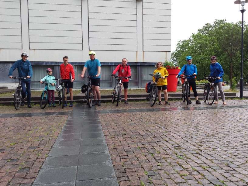 Bildunterschrift: Bei der Abschlusstour fanden sich trotz des Wetters und des EM-Spiels ein paar engagierte Radfahrer ein, darunter die beiden Stadtradelstars Michael Kunte und Richard Hackländer (3. und 4. v.l.)