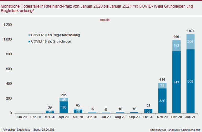Die amtliche Statistik erweitert ihr Datenangebot um vorläufige Ergebnisse aus der Todesursachenstatistik, die erstmals für den Zeitraum Januar 2020 bis Januar 2021 veröffentlicht werden. Laut Statistischem Landesamt in Bad Ems umfassen die Ergebnisse die wichtigsten Diagnosegruppen und Einzeldiagnosen inklusive COVID-19 und sollen zukünftig monatlich aktualisiert werden. Das neue Datenangebot ist Antwort auf den wachsenden Bedarf nach aktuellen Zahlen zum Pandemiegeschehen und soll die bestehende jährliche Todesursachenstatistik ergänzen. Im Rahmen der ersten Auswertungsrunde wurden für das Jahr 2020 insgesamt 1.836 Todesfälle in Rheinland-Pfalz ausgewiesen, bei denen COVID-19 auf der Todesbescheinigung vermerkt war. In fast 82 Prozent der Fälle war COVID-19 das sogenannte Grundleiden, das heißt, die Krankheit war die Todesursache. In den restlichen nachrichtlich festgehaltenen Fällen wurde COVID-19 als Begleiterkrankung vermerkt; die Personen sind also „mit COVID-19 verstorben“, hatten jedoch ein anderes Grundleiden. Bei der Einordnung dieser Ergebnisse gilt es zu berücksichtigen, dass erst knapp 84 Prozent der Todesfälle von Dezember 2020 ausgewertet wurden und sich die Fallzahlen daher noch erhöhen können. Für den gesamten Berichtszeitraum Januar 2020 bis Januar 2021 wurden für Rheinland-Pfalz mehr als 97 Prozent aller Todesfälle verarbeitet.