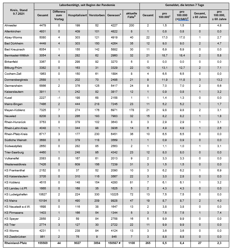 Coronavirus SARS-CoV-2: Aktuelle Fallzahlen für Rheinland-Pfalz, (Datenstand vom 09.07.2021, 14:10 Uhr)