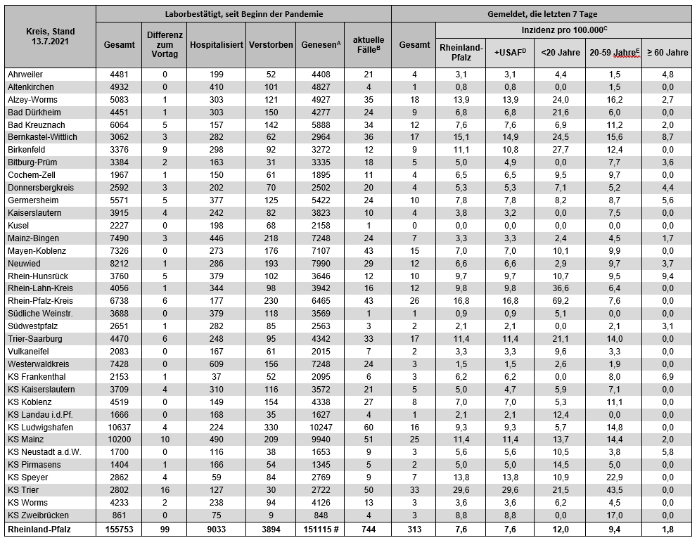 Coronavirus SARS-CoV-2: Aktuelle Fallzahlen für Rheinland-Pfalz, (Datenstand vom 13.07.2021, 14:10 Uhr)