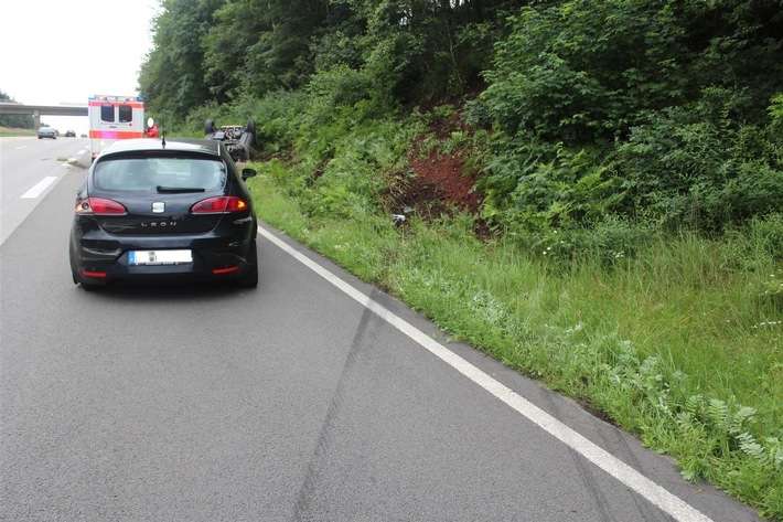 Am 12.07.2021, gegen 19:30 Uhr, befuhr ein bislang unbekannter Lkw die BAB 6 zwischen den Anschlussstellen Kaiserslautern-Ost und Enkenbach-Alsenborn in Fahrtrichtung Mannheim. In Höhe des Parkplatzes „Quaidersberg“ wechselte der Lkw vom rechten auf den mittleren von drei Fahrstreifen, um einem anderen Lkw das Einfädeln vom Parkplatz zu ermöglichen. Beim Fahrstreifenwechsel übersah der Lkw-Fahrer einen auf der mittleren Spur fahrenden Seat, der nach links ausweichen musste, um eine Kollision mit dem Lkw zu vermeiden. Dabei krachte der Seat in einen auf der linken Spur fahrenden SUV. Der SUV schleuderte in die Mittelschutzplanke, dann quer über die Fahrbahn nach rechts und rutschte in den Grünstreifen und überschlug sich.