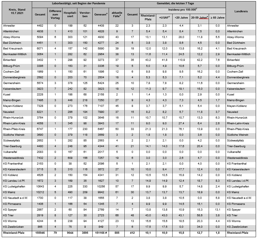 Coronavirus SARS-CoV-2: Aktuelle Fallzahlen für Rheinland-Pfalz, (Datenstand vom 15.07.2021, 14:10 Uhr)