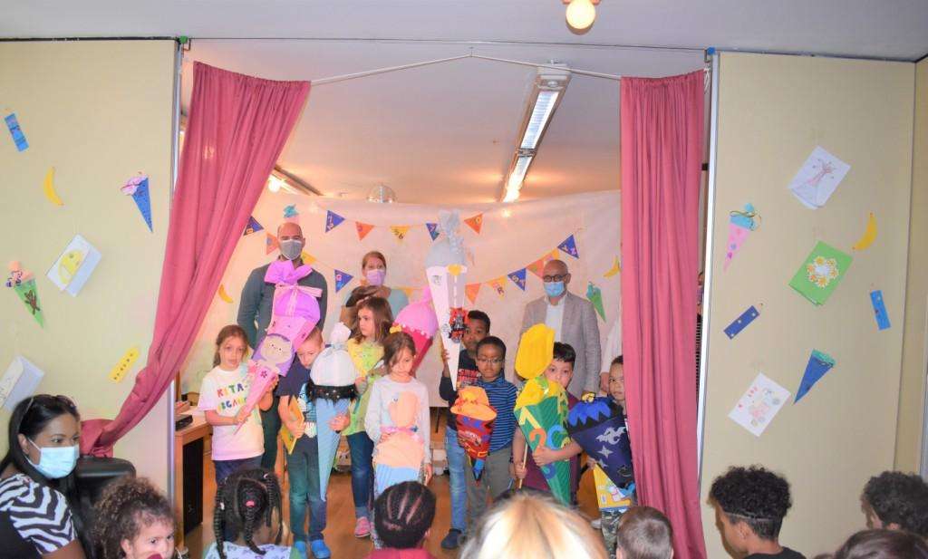 Am Vormittag versammelten sich die dreizehn Schulanfänger im Speiseraum der Kindertagesstätte. Zusammen mit Bettina Blomeier von der Sprachförderung, dem Bildungsbüro, der Künstlerin Izabella Koch und dem Hortteam rund um Andreas Sander wurde gestaltet, gesungen und gespielt. Als krönender Abschluss erhielten die Kinder ihre Schultüten. Dank einer Spende von Andreas Himmer, selbst ehemaliges Hort-Kind, konnten diese prall mit nützlichen Schreibartikeln und Leckereien gefüllt werden.